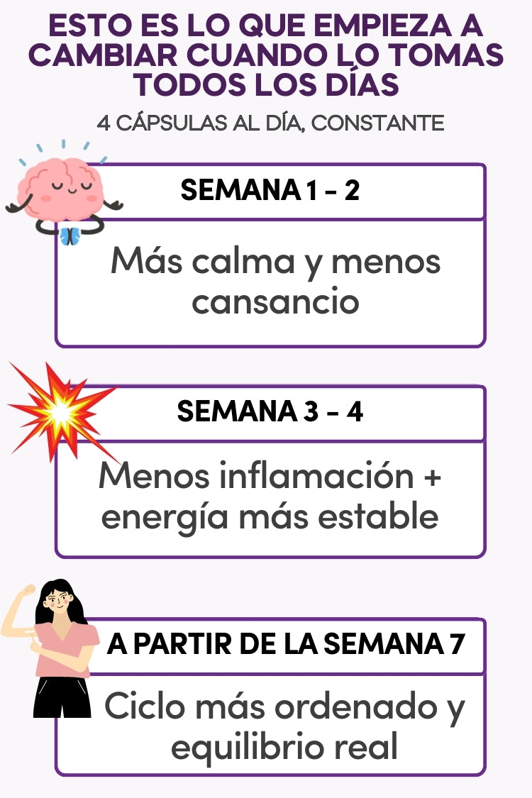 Los primeros cambios se sienten entre 3 y 4 semanas, y los resultados más claros con uso constante a partir de 8 semanas.